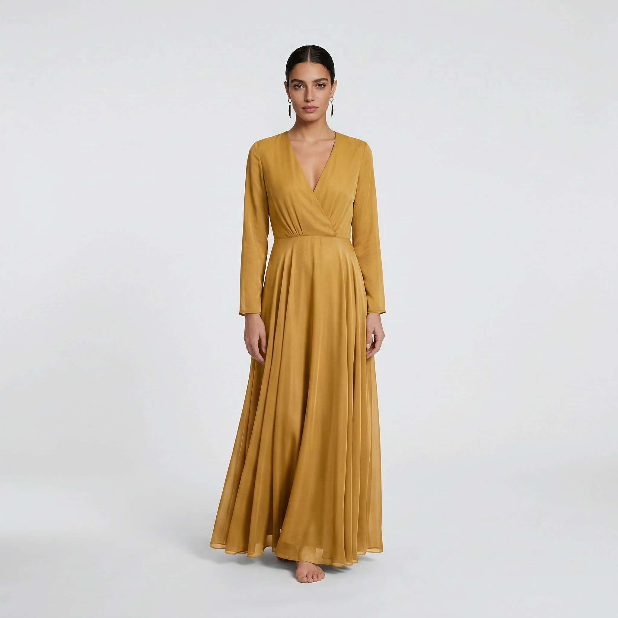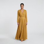 Infuse your formal wardrobe with the warm, rich tones of our Radiant Golden Mustard Maxi Gown. This piece is designed for those who seek a bold yet sophisticated aesthetic. Featuring a classic wrap-style bodice and long, flowing sleeves, the vibrant mustard hue provides a luxurious look that is perfect for both daytime celebrations and evening galas.