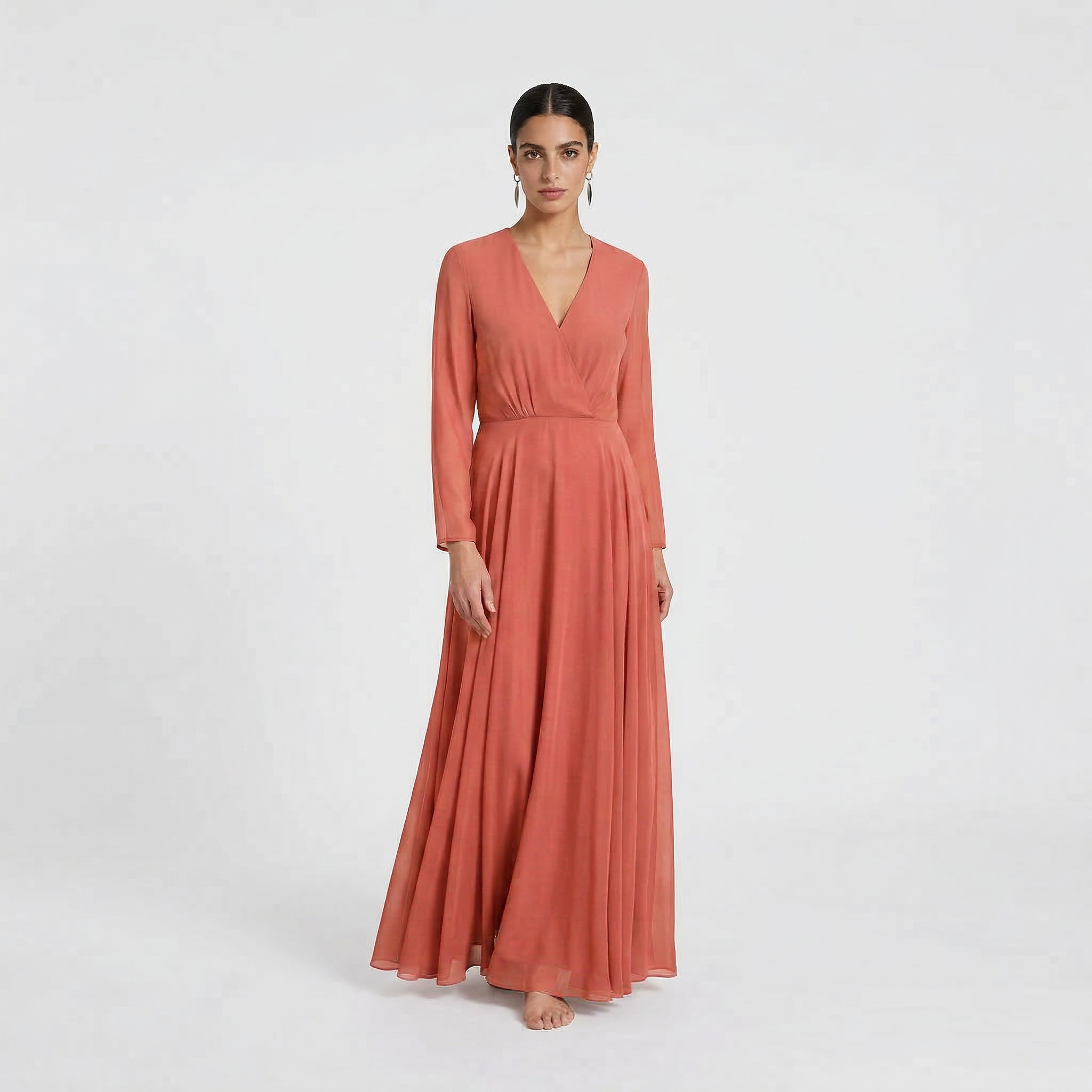 • Design Highlights: Modest long-sleeve profile, elegant surplice wrap-style V-neckline, and a gathered natural waistline that leads into a voluminous, floor-length skirt.